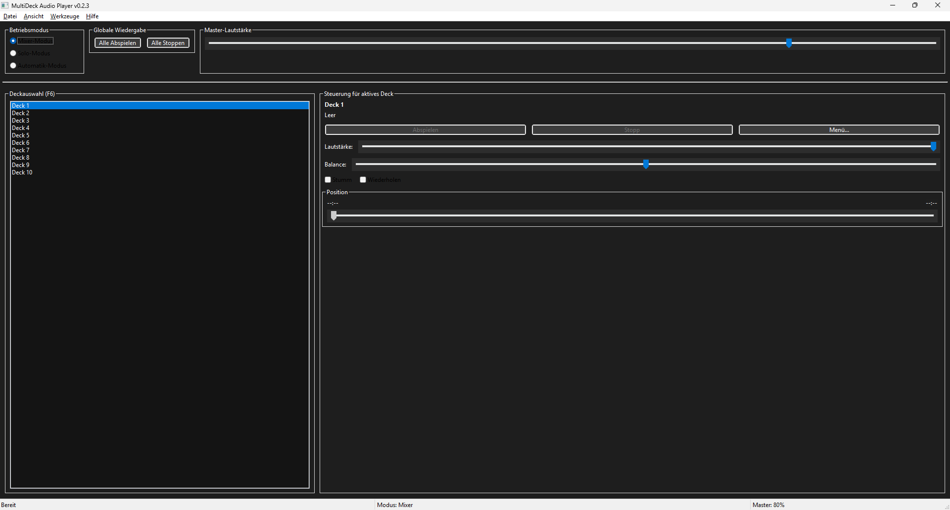 Die Deckansicht rechts neben der Auswahlliste verfügt über eine Reihe von Steuerelementen. Neben den Standardschaltflächen für Wiedergabe/Pause und Stop sind Regler für die Lautstärke und Balance integriert. Im Mixermodus kann man auf diese Weise einzelne Dateien herunterregeln, um ein Übersteuern des Gesamtmixes zu verhindern. Monodateien lassen sich über den Balance-Regler in Soundkollagen nach links oder rechts verschieben. Über ein Kontextmenü lässt sich jedes einzelne Deck verwalten. Eine globale Wiedergabesteuerung vervollständigt den Mixer und ermöglicht die Steuerung aller Decks auf einmal.